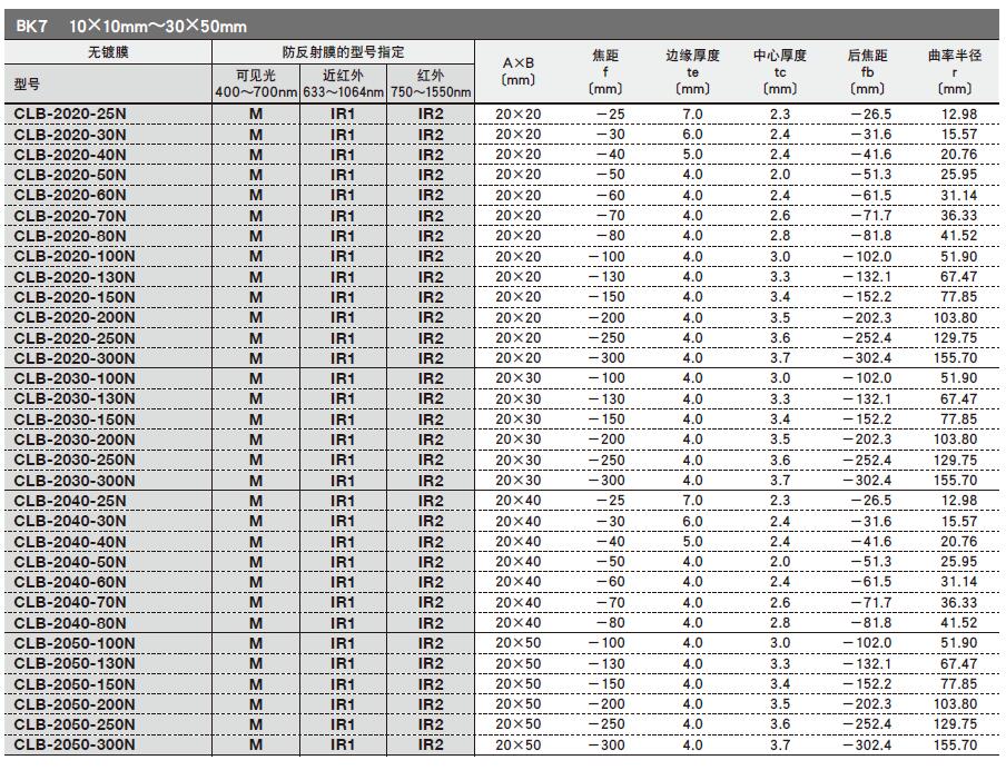 OLBCY系列平凹柱面透鏡相關(guān)參數(shù):
