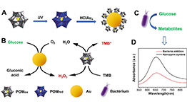 近期,南京師范大學王琛教授課題組采用一步還原法制備了雙重酶級聯(lián)反應Au@POM 納米顆粒子,實驗采用金黃色葡萄球菌和大腸桿菌作為模型,以可見光波段光譜吸收強度為依據(jù),分析細菌代謝過程中葡萄糖濃度與細菌代謝速度關系。實驗證明,Au@POM納米酶級聯(lián)催化反應在細菌含量為1-7.5 x 107 CFU mL-1呈線性關系,檢測限為5 CFU mL-1。