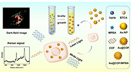 南京師范大學王琛教授課題組在Au納米粒子上覆蓋二維共價有機框架(COFs)構建尺寸可控、富集力強、穩(wěn)定性高和生物相容性更好的核殼結構(Au@COF)生物傳感器。并用拉曼光譜/暗場散射成像雙模技術實時監(jiān)測活細胞中過氧化氫代謝物水平。實驗結果證明,該生物納米傳感器簡單、高效,可實現(xiàn)過氧化氫和細胞代謝產(chǎn)物的在線檢測。本研究為開發(fā)基于COF的SERS生物傳感平臺提供了實驗思路,為細胞代謝產(chǎn)物相關疾病早期診斷提供一種有效方法。