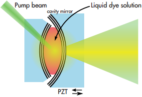 通常情況下,我們使用溶解在甲醇或者乙二醇(均可作為熱浴或者粒子庫(kù))中的羅丹明6G染料。微腔截止能量(反射鏡間距)由PZT主動(dòng)控制。