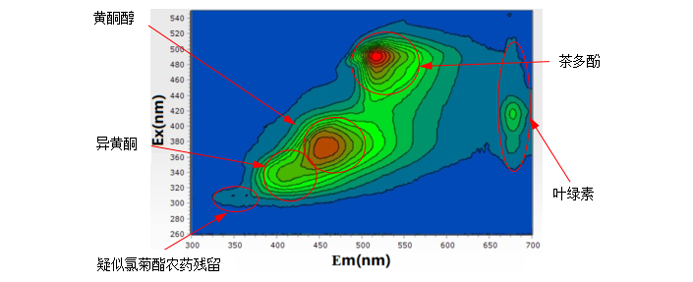 每種茶葉中均含有黃酮醇、茶多酚、葉綠素c、葉綠素a,其含量影響著茶葉的感官品質,使用三維熒光能快速檢測茶葉中四中物質的相對含量,進而通過三維熒光光譜對茶葉進行分級。另外三維熒光譜對茶葉中氯菊酯農(nóng)藥殘留也有較好的檢測效果。