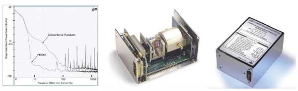 美國(guó)SRS公司銣鐘PRS10的10MHz輸出來(lái)自第三倍頻,應(yīng)力補(bǔ)償(SC-cut)晶體振蕩器工作在一個(gè)恒溫室中,雙回路RF合成器(晶體頻率22.482MHz)產(chǎn)生359.72MHz,并讓6.834 GHz頻率通過(guò)階躍恢復(fù)二極管。這樣的設(shè)計(jì)可以使相位噪聲非常低(< −130 dBc/Hz at 10 Hz),即便在沒(méi)有鎖定銣原子的情況下,其輸出表現(xiàn)也很良好(老化率:<5 × 1E−10 /day),與傳統(tǒng)銣鐘相比相位噪聲降低42dB(如下圖),并使用側(cè)臂裝有1毫克銣的燈。消除了銣耗盡作為一種失效機(jī)制,并提供了更好的溫度控制,而沒(méi)有多余的閃爍噪聲。