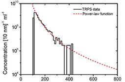 我們改進(jìn)了TRPS系統(tǒng)上層液體,(Izon Science Ltd, Christchurch, New Zealand) 使膜孔有了光學(xué)延展性。改進(jìn)之后,我們?cè)u(píng)估了TRPS檢測(cè)人體尿液囊泡的尺寸和濃度。之所以選擇尿液囊泡,是因?yàn)槟蛞豪锖休^高濃度的尿液囊泡,同時(shí)脂蛋白和蛋白質(zhì)集結(jié)的污染程度較小。圖3顯示了用TRPS測(cè)量的尿液囊泡的尺寸分布以及濃度,尿液囊泡的濃度隨著尺寸的增加而降低,我們能檢測(cè)到的*小尺度的尿囊為100nm直徑