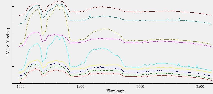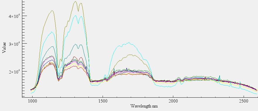 選取不同的目標(biāo)對象,獲取相應(yīng)的光譜,植被的光譜在680nm以后分反射率會提高,而非植被所表現(xiàn)出來的紅邊效應(yīng)與真實的植被的紅邊效應(yīng)有很大的差別。
