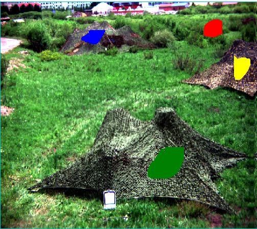 在圖4和圖5所示的是對原始數(shù)據(jù)進行數(shù)據(jù)處理后的影像,同樣能夠區(qū)分開目標(biāo)對象與背景的影像,偽裝網(wǎng)如圖中所示標(biāo)注的位置。