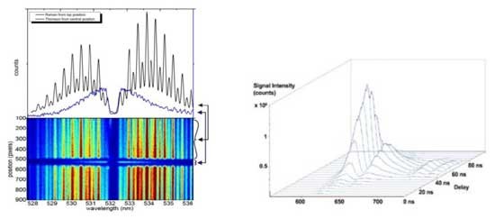 通常來講,等離子環(huán)境具有高動態(tài)和瞬時的特性,所以成像及光譜信息要在數(shù)十納秒(甚至皮秒量級)的時間內(nèi)進(jìn)行捕獲。此時普通探測器無法提供這么高的時間分辨率,像增強型探測器(ICCD/ICMOS)是較為合適的探測器,它的像增強器光陰極門控能提供納秒量級的時間閘門。特定波長的帶通可以篩選出特定化學(xué)結(jié)構(gòu)(分子,原子團(tuán),原子,離子等)的特征光譜,濾光片只需要在ICCD相機前安裝好,就可以用于2D PLIF或者LIF圖像的采集。