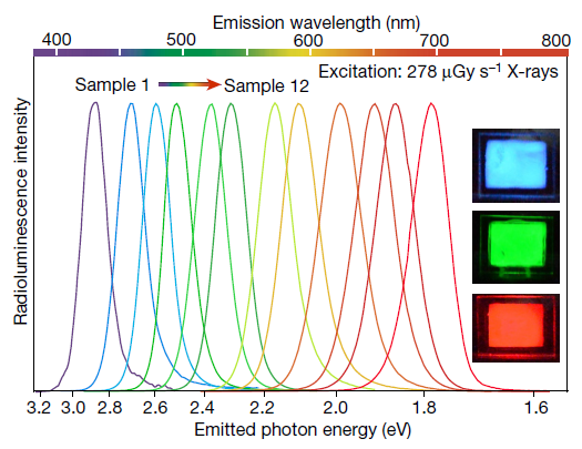在X射線照射下全無(wú)機(jī)鈣鈦礦納米晶閃爍體的可調(diào)諧發(fā)光(數(shù)據(jù)截取自文章“All-inorganic Perovskite Nanocrystal Scintillators”)