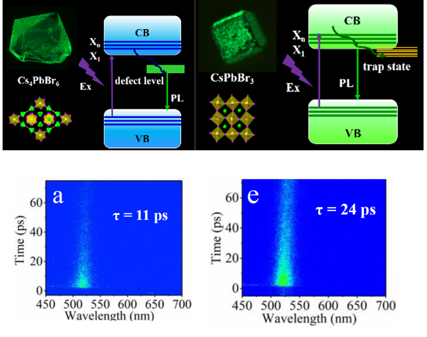 蘭州大學(xué)利用條紋相機(jī)得到的 Cs4PbBr6 以及 CsPbBr3 鈣鈦礦材料的超快熒光組分壽命數(shù)據(jù)(文章發(fā)表在2019年10月9日的 Physical Chemistry Letters ),文章中提到,鈣鈦礦材料Cs4PbBr6 在之前用TCSPC 做壽命測試的時(shí)候,壽命為2.6ns(69%),15ns(31%), CsPbBr3 無法測到,因?yàn)槌隽藘x器測試的極限! 然后用條紋相機(jī)測試時(shí),發(fā)現(xiàn)了更快的壽命組分,分別為: Cs4PbBr6 (11 ps) and CsPbBr3 (24 ps)。 證明了Cs4PbBr6的衰變速度明顯快于CsPbBr3。