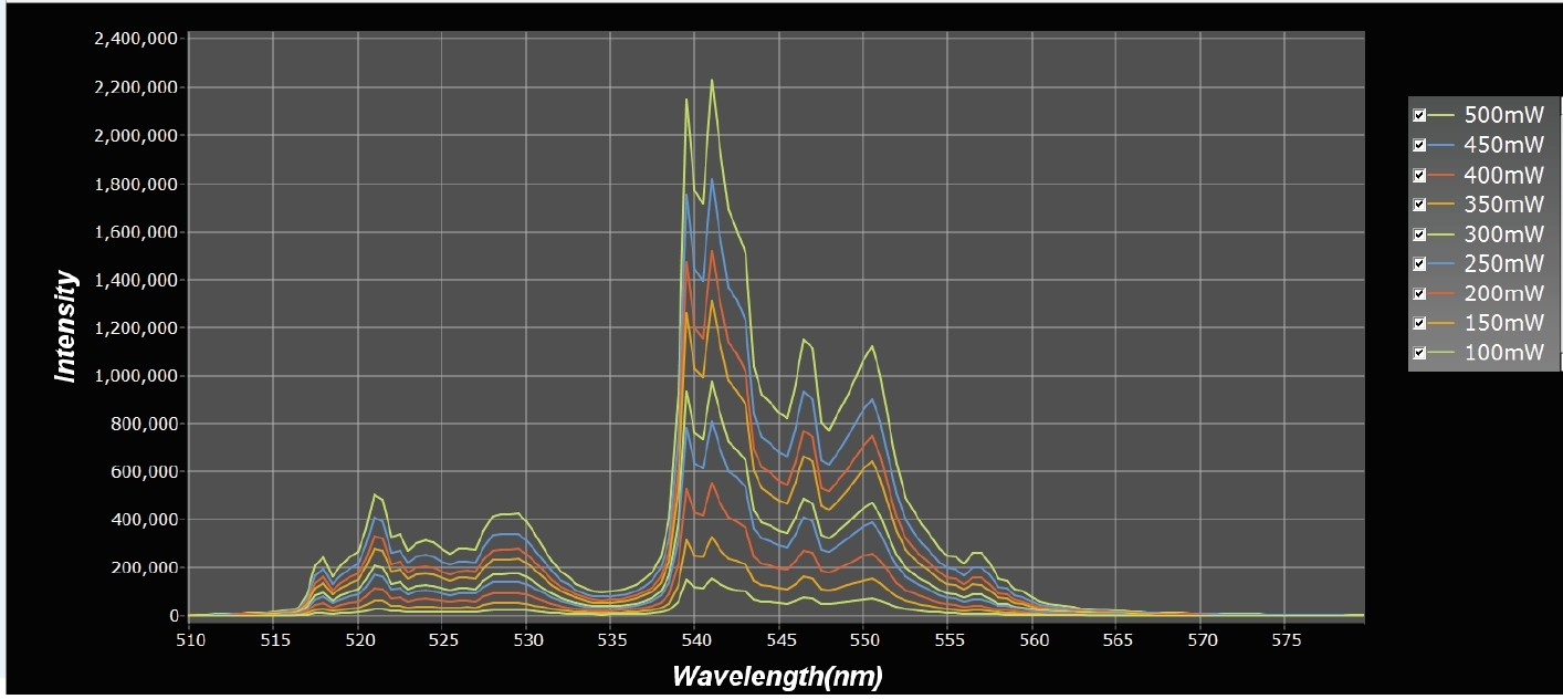 圖2. NaYF4:YbEr的變功率上轉換光譜測試
