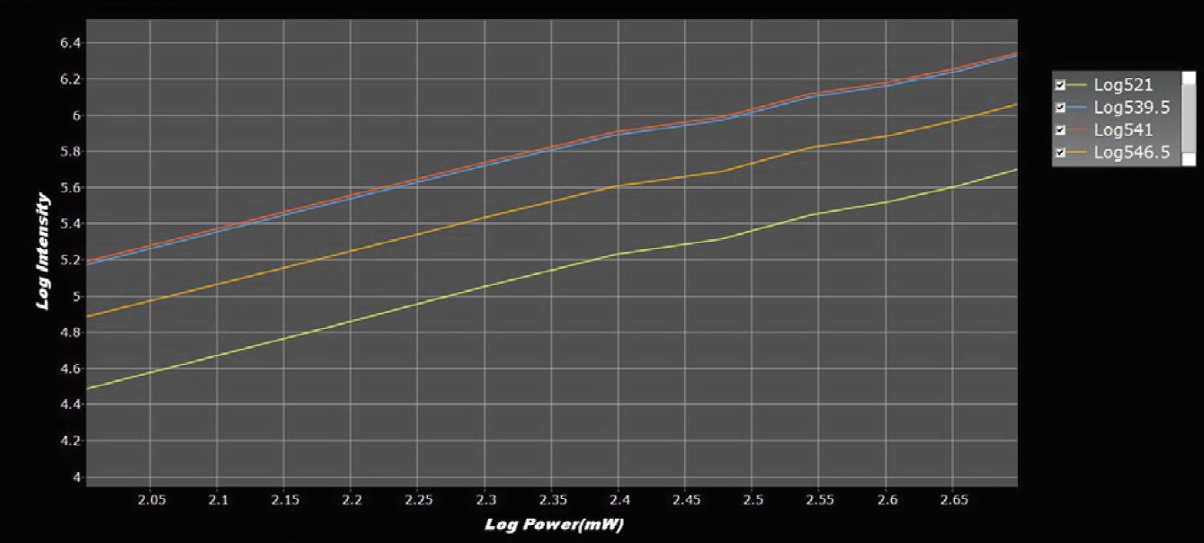 圖4. NaYF4:YbEr 特征峰強度VS 激發(fā)光功率的雙對數(shù)曲線
