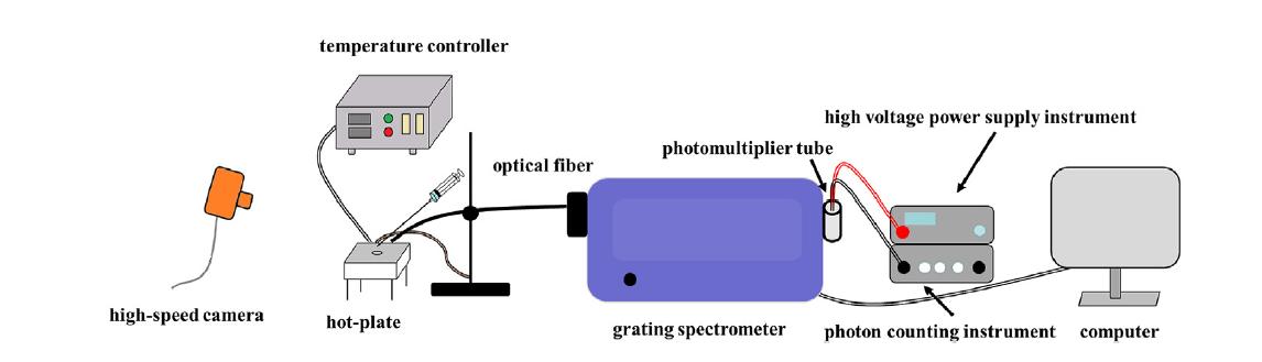 上圖為相關(guān)的實(shí)驗(yàn)簡圖,圖中科學(xué)家將摻有一定比例活化劑的煤油滴到變溫臺(tái)上,變溫臺(tái)可以從100度到600多度控制,高速相機(jī)拍攝液滴在變溫臺(tái)上隨溫度變化后的燃燒情況。而在燃燒時(shí)火焰發(fā)光通過光纖收集到光譜儀中,再由PMT監(jiān)控發(fā)光波段隨時(shí)間變化的衰減過程。整個(gè)實(shí)驗(yàn)中,監(jiān)控燃燒產(chǎn)物OH自由基的發(fā)光波段306.5nm,光譜儀將色散位置設(shè)置到該波段,然后用PMT進(jìn)行監(jiān)控。監(jiān)控過程中PMT高壓設(shè)置為1000V,使其處于光子計(jì)數(shù)狀態(tài),然后連接數(shù)采,對(duì)OH發(fā)光進(jìn)行實(shí)時(shí)監(jiān)控掃描。