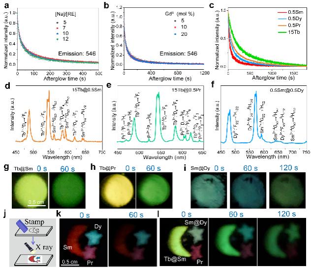 課題組通過創(chuàng)新性地在NaLuF4基質(zhì)晶格中引入Na+間隙,大幅增強了稀土激活離子(Tb,Dy,Pr和Sm)的X射線余輝發(fā)光,結(jié)合光譜分析與*一性原理計算,提出了Na+間隙促進陰離子弗蘭克缺陷的形成機制;采用核殼結(jié)構(gòu)空間分離不同類型的稀土激活離子,實現(xiàn)了無外場刺激條件下依賴于時間維度的多種余輝顏色演變體系(圖2)。