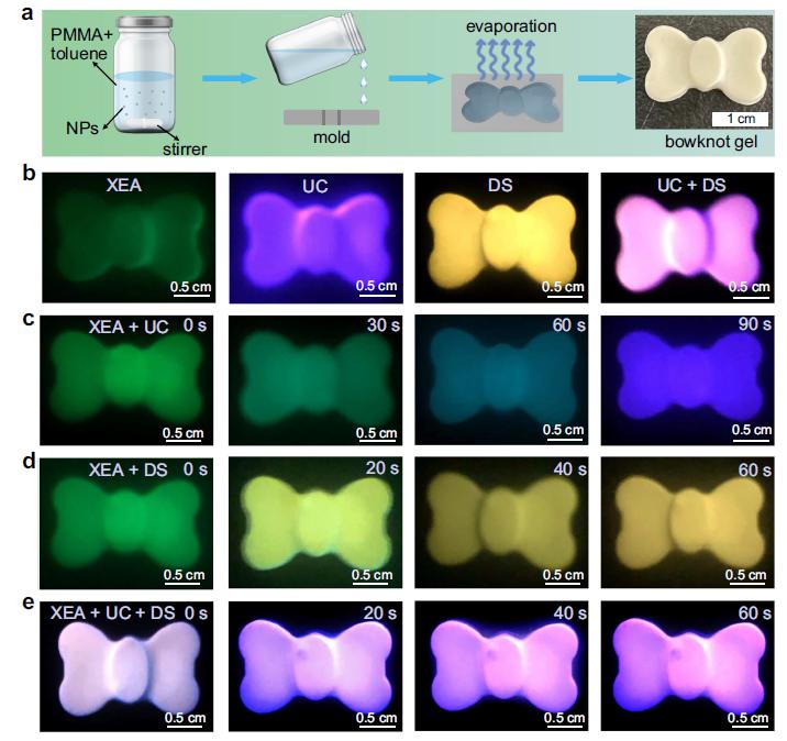 文章結(jié)尾用一個有趣的實驗為讀者展示了XEA材料在多維顯示器件中的應(yīng)用場景(圖4)。作者分別使用了Tb@Ce/Sm@Yb/Tm, Tb@Pr,和NaLuF4:Yb/Tm(僅具有核結(jié)構(gòu))的納米粒子作為繪畫原料畫出云朵、樹木和小船。采用僅具有核結(jié)構(gòu)的NaLuF4:Yb/Ho and NaLuF4:Pr畫出月亮,而湖泊則使用Na3HfF7:Yb/Er和NaLuF4:Yb/Ho(僅有核結(jié)構(gòu))的混合物繪畫得到。然后使用X射線對這幅畫進行照射。當(dāng)X射線照射停止后,畫面顯示出綠色的云彩、紅色的月亮,黃色的樹木和藍綠色的湖泊。在經(jīng)過30s后,畫面的亮度變暗了,而樹木卻變成了綠色。當(dāng)使用980nm激光和254nm的紫外燈同時照射這幅畫的時候,云朵的顏色從綠色變成了紅色,月亮則從之前的紅色變成了黃色,樹木的顏色由黃色變成綠色,而湖泊的顏色從藍綠色變成了紅色,藍色的船也出現(xiàn)了。