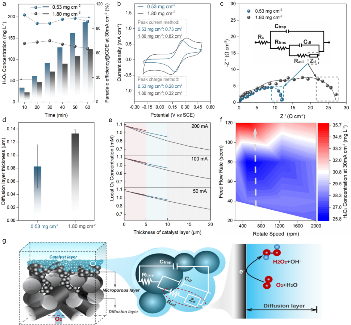 本文構建兩種不同催化劑負載量的GDEs來探究界面反應物(O2)傳質擴散和聚集效應。實驗發(fā)現(xiàn)增加催化劑負載量會增加GDE電化學活性面積,H2O2法拉第效率下降至~70%,這說明低負載量電極具有更高的活性位利用率;結合EIS分析界面擴散動力學發(fā)現(xiàn),減少催化劑負載量導致擴散層厚度下降,促進O2輸運,進而構建富氧界面微環(huán)境,證明了構建O2富集的界面環(huán)境是提高活性位利用效率,強化反應活性的關鍵。