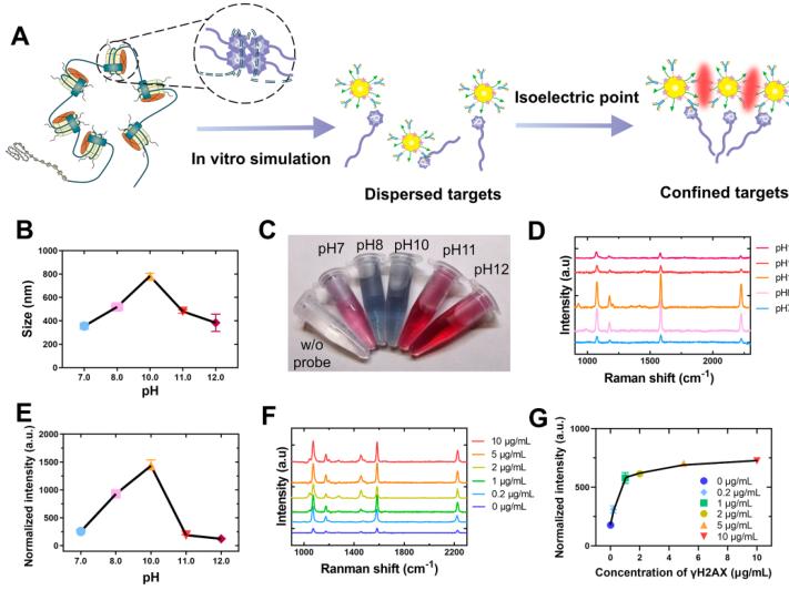 圖3 (A)γH2AX靶點體外模擬方案略.(B) γH2AX尺寸與PH值關(guān)系(C)加入抗-γH2AX@GPMT.后實物圖(D)不同PH值孵育環(huán)境下,抗-γH2AX@GPMT的拉曼光譜。(E) 抗-γH2AX@GPMT在2230cm-1拉曼強(qiáng)度與PH值關(guān)系。(F) 不同濃度的γH2AX肽孵育的抗-γH2AX@GPMT的拉曼光譜圖(G)抗-γH2AX@GPMT在2230cm-1拉曼強(qiáng)度與γH2AX肽濃度關(guān)系