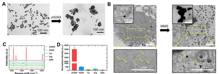 圖4 抗-γH2AX@GPMT的靶誘導(dǎo)機(jī)制.(A)加入γH2AX肽前后抗-γH2AX@GPMT的TEM圖像(B) 抗γ的生物TEM圖像H2AX@GPMTγH2AX孵育前后。(C)抗-γH2AX@GPMT拉曼光譜(D)抗-γH2AX@GPMT的2230 cm−1拉曼光譜歸一化強(qiáng)度