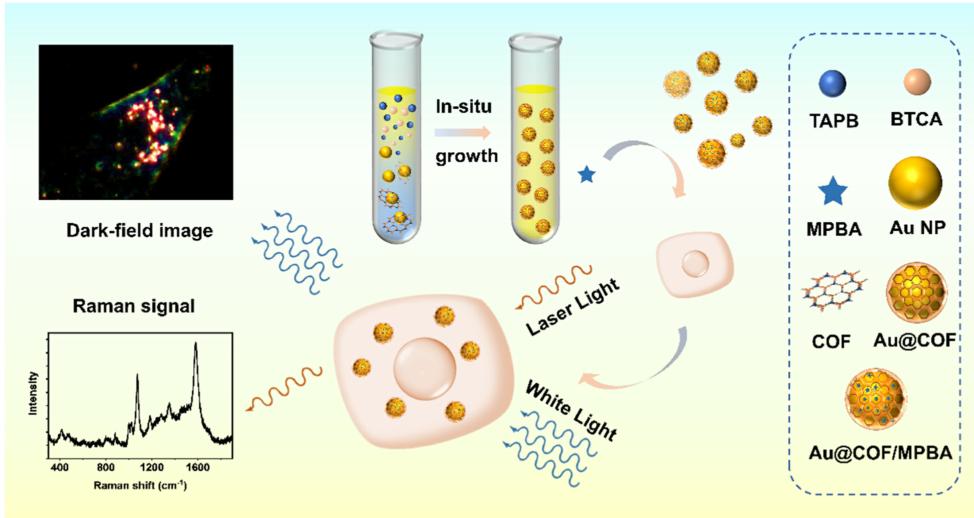 南京師范大學(xué)王琛教授課題組在Au納米粒子上覆蓋二維共價有機框架(COFs)構(gòu)建尺寸可控、富集力強、穩(wěn)定性高和生物相容性更好的核殼結(jié)構(gòu)(Au@COF)生物傳感器。并用拉曼光譜/暗場散射成像雙模技術(shù)實時監(jiān)測活細(xì)胞中過氧化氫代謝物水平。實驗結(jié)果證明,該生物納米傳感器簡單、高效,可實現(xiàn)過氧化氫和細(xì)胞代謝產(chǎn)物的在線檢測。本研究為開發(fā)基于COF的SERS生物傳感平臺提供了實驗思路,為細(xì)胞代謝產(chǎn)物相關(guān)疾病早期診斷提供一種有效方法。