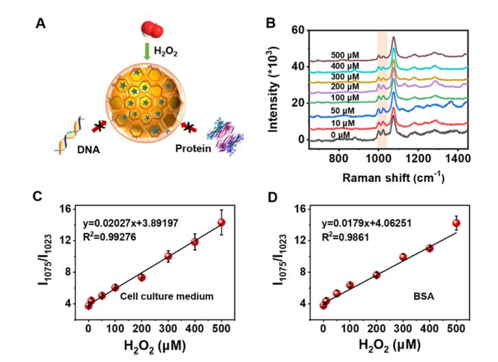 圖4(A) COF外殼保護作用示意圖,COF外殼阻擋大分子進入;(B)細(xì)胞培養(yǎng)基中不同H2O2濃度下Au@COF/MPBA的拉曼光譜圖;(C-D)細(xì)胞培養(yǎng)基和BSA溶液中,I1075/I1023拉曼峰強度比與H2O2濃度函數(shù)關(guān)系,Au@COF為0.5nM。
