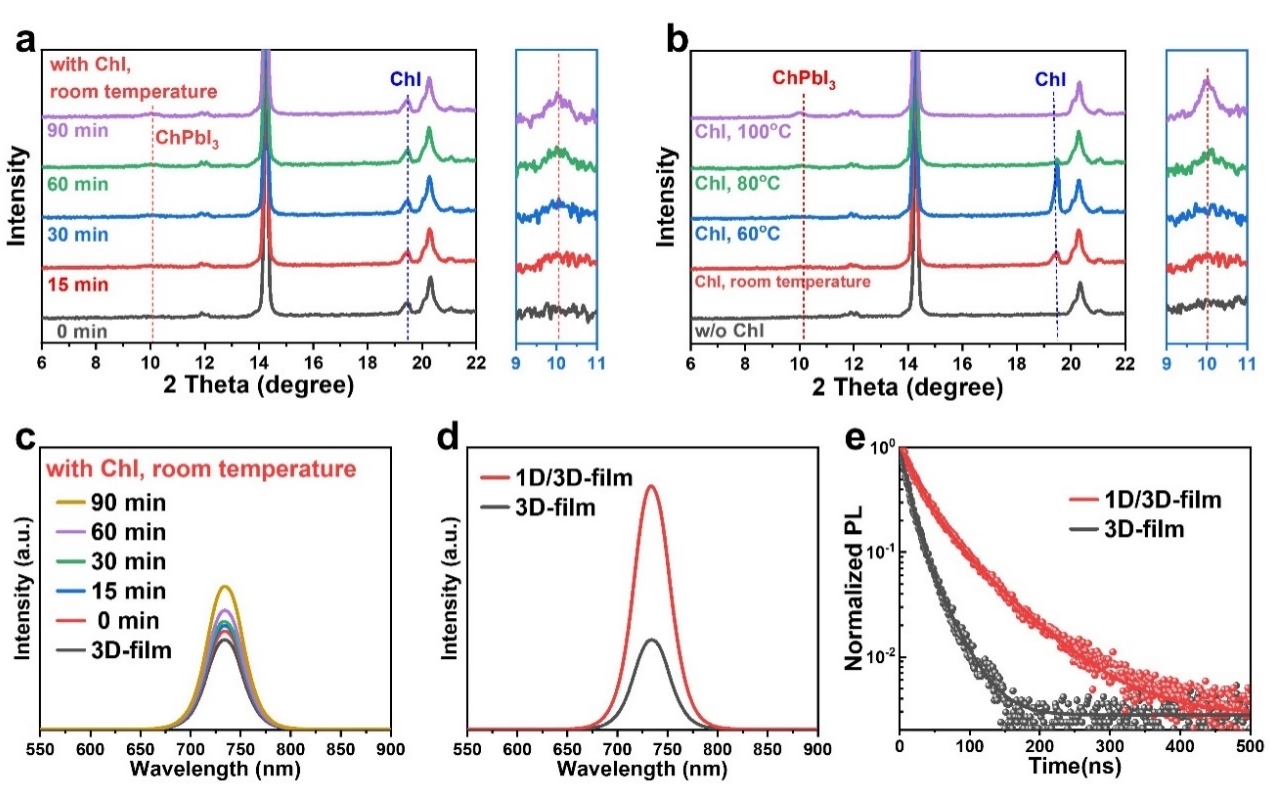Figure 2. a) Evolution of XRD patterns of CsPbI3 films with ChI treatment over time at room temperature (25 °C). b) XRD patterns of CsPbI3 films without and with ChI treatment annealed at different temperature for 15 min. c) PL spectra for CsPbI3 films with ChI treatment over time at room temperature. d) PL spectra for 3D-film and 1D/3D-film. e) PL delay curves of 3D-film and 1D/3D-film.