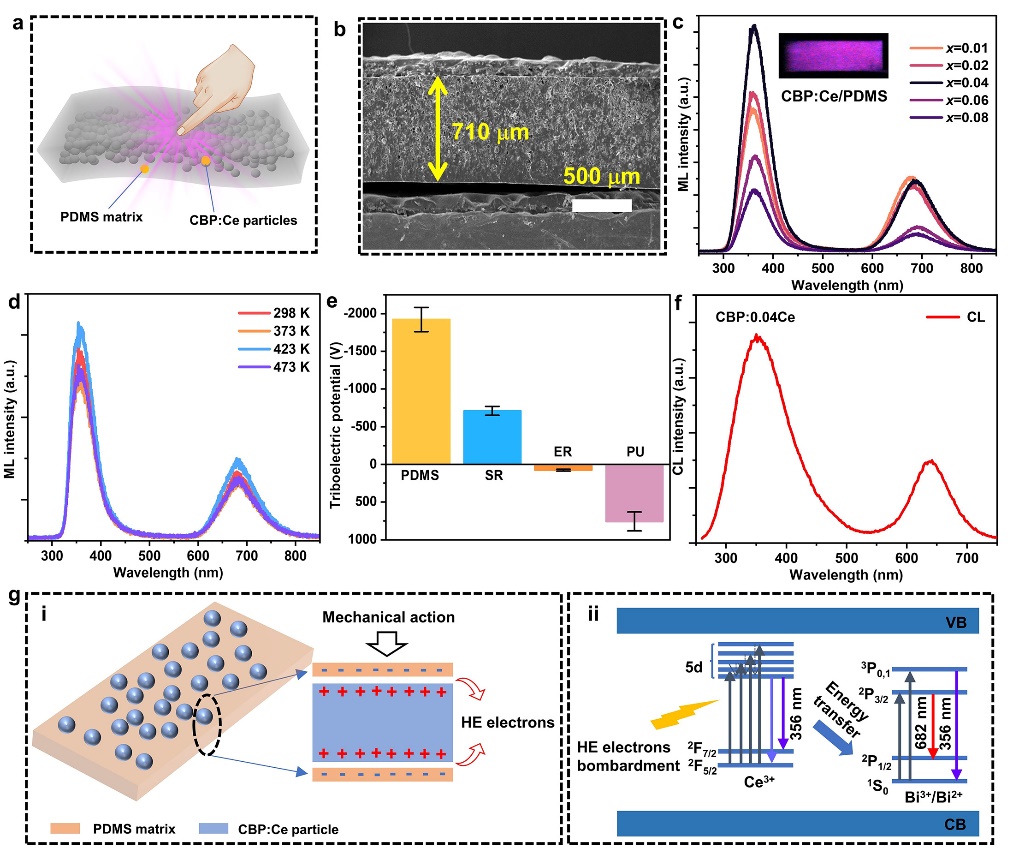 本文報(bào)道了一種高效的力致發(fā)光復(fù)合彈性體CBP:Ce/PDMS。由于CBP晶體的限制,結(jié)構(gòu)中同時(shí)存在具有發(fā)光特性的Bi3+和Bi2+離子。Ce3+的摻雜進(jìn)一步表現(xiàn)出向Bi離子的有效能量轉(zhuǎn)移,因此CBP:Ce/PDMS在機(jī)械刺激下表現(xiàn)出獨(dú)特且增強(qiáng)的近紫外和深紅雙波段發(fā)射。對熱釋光、陰極發(fā)光、摩擦電特性以及基體效應(yīng)的進(jìn)一步研究表明,力學(xué)激發(fā)/激活過程可以用界面摩擦起電誘導(dǎo)的電子轟擊模型解釋。CBP:Ce/PDMS的力致發(fā)光進(jìn)一步用于兩類應(yīng)用:通過采用近紫外力致發(fā)光作為激發(fā)源,多種僅具有光致發(fā)光的材料也可以表現(xiàn)出力致發(fā)光;通過深紅色力致發(fā)光在模擬組織中的穿透和傳感能力, CBP:Ce/PDMS還可應(yīng)用于生物力學(xué)原位檢測。
