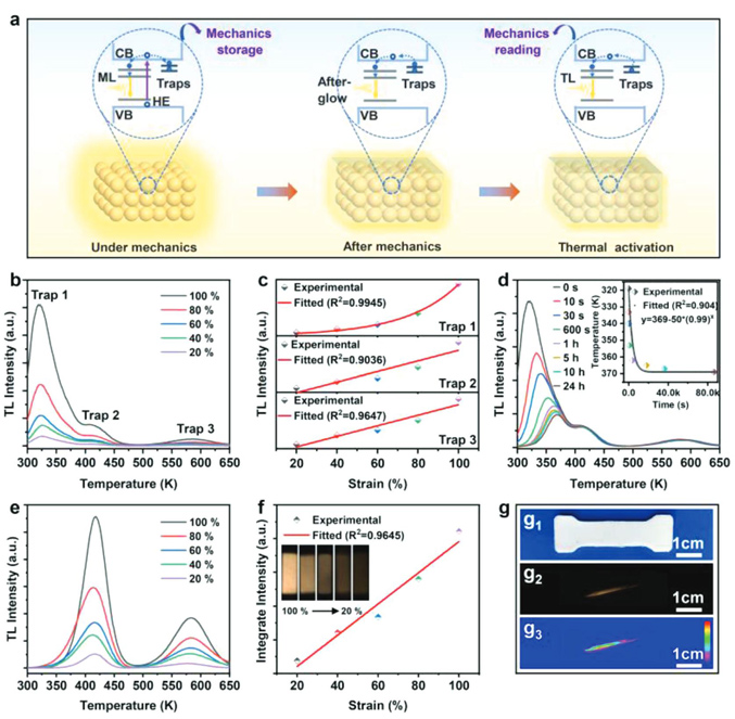 通過利用SAOCD/PDMS材料中特有的自充能物理過程,進一步發(fā)展出了一種力學信息的存儲與可視化讀取技術(圖4)。在機械刺激下,力學信息將會以陷阱捕獲載流子的方式在材料內部進行存儲,隨后,在熱刺激下,所存儲的力學信息將以可視化的形式得到讀取,所存儲和讀取的力學信息主要包括力學強度、發(fā)生時間及其空間分布等。