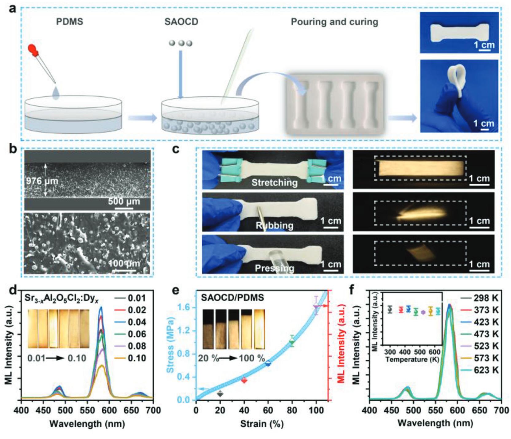 當施加拉伸、摩擦、壓縮等力學刺激時,復合彈性體呈現出直接的自激活力致發(fā)光,不需要額外的預輻照(圖1c)。復合彈性體的力致發(fā)光性能隨SAOCD顆粒中Dy的含量增加呈現出先增后減的趨勢(圖1d)。隨著施加應變的增加,SAOCD/PDMS彈性體的ML強度隨之增加,其在應力/應變傳感方面表現出良好的應用價值。此外,該復合彈性體的力致發(fā)光還表現出良好的熱穩(wěn)定性(圖1f)。