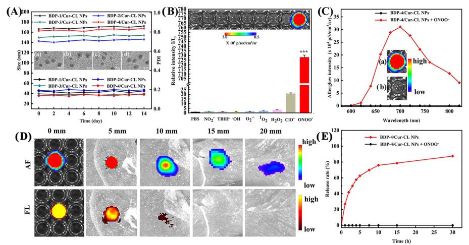 通過引入具有特異性O(shè)NOO−響應(yīng)基元,實現(xiàn)對化學發(fā)光型探針的發(fā)光強度、發(fā)射波長、發(fā)光效率、發(fā)光時間和特異性響應(yīng)性質(zhì)的調(diào)控。之后,將其與姜黃素通過可響應(yīng)性斷裂的化學鍵連接,設(shè)計合成出新穎的對ONOO−具有特異性選擇性啟亮功能的化學發(fā)光探針分子BDP-4/Cur-CL。在沒有ONOO-的情況下,余輝信號和姜黃素的釋放不會發(fā)生,但在ONOO−刺激下,亮度高達732倍,姜黃素的釋放率到達86%。BDP-4/Cur-CL NP表現(xiàn)出明亮的近紅外余輝發(fā)光(697nm)、極好的靈敏度(LOD=82.67nM)、高能量轉(zhuǎn)移效率(94.6%)、深組織穿透(20mm),有望為在腦卒中精準診療提供新材料和新思路。
