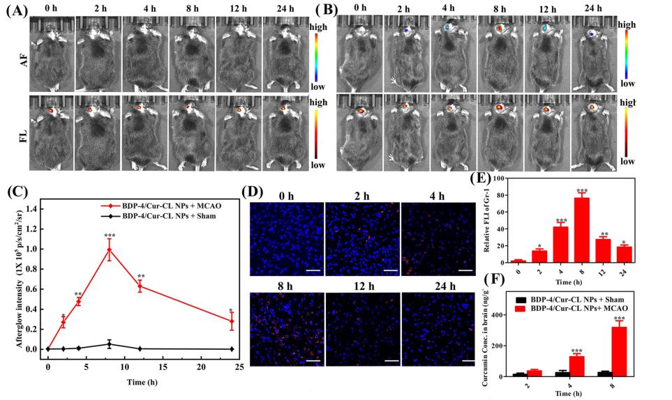 作者設(shè)計了由BDP-4和Cur-CL單元組成的ONOO−激活的近紅外余輝圖像引導納米顆粒(命名為BDP-4/Cur-CL NPs)。該系統(tǒng)可以特異性和敏感性地評估內(nèi)源性O(shè)NOO-水平,以揭示I/R腦損傷的進展,并動態(tài)監(jiān)測姜黃素的釋放,以進行安全的IS治療。BDP-4/Cur-CL NPs表現(xiàn)出明亮的NIR余輝發(fā)光(*大增加732倍)、高靈敏度(檢測極限,LOD=82.67nM)、高能量轉(zhuǎn)移效率(94.6%)、深層組織穿透(20mm)以及突出的抗凋亡和抗炎作用。通過使用這種復雜的設(shè)計,BDP-4/Cur-CL NPs在小鼠體內(nèi)I/R腦損傷的發(fā)生和發(fā)展過程中激活NIR余輝信號并提供三重功能:(i)準確區(qū)分i/R損傷和正常區(qū)域;(ii)內(nèi)源性的實時報告病變區(qū)域的ONOO−水平;(iii)動態(tài)姜黃素釋放狀態(tài)的監(jiān)測。此外BDP-4/Cur-CL NPs有效降低細胞凋亡,增強存活率,減輕神經(jīng)炎癥,減少梗死體積和增強的卒中結(jié)果。