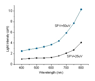 圖3 表面光電壓強(qiáng)度SPV=25uV/50uV下,測(cè)量并繪制光強(qiáng)值和波長的曲線圖