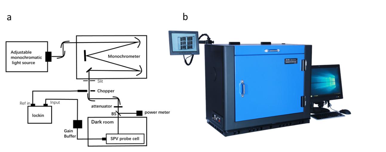 圖1表面光電壓測(cè)試系統(tǒng): a測(cè)試系統(tǒng)示意圖; b測(cè)試系統(tǒng)實(shí)物圖