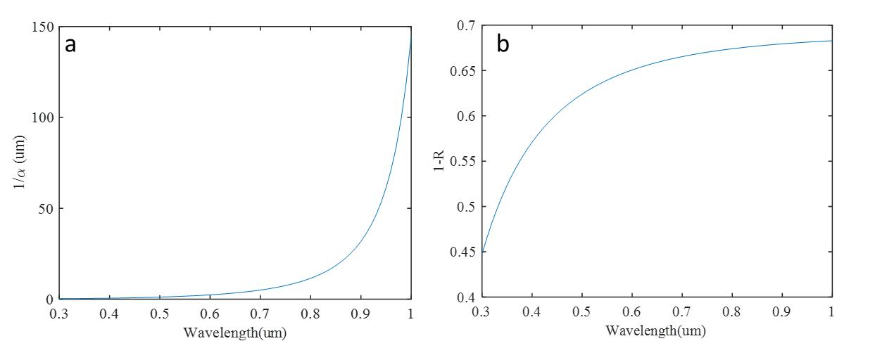 圖4a根據(jù)公式1得到吸收系數(shù)的倒數(shù)和波長的關(guān)系; 圖4b根據(jù)公式2得到(1-R(λ))和波長的關(guān)系。
