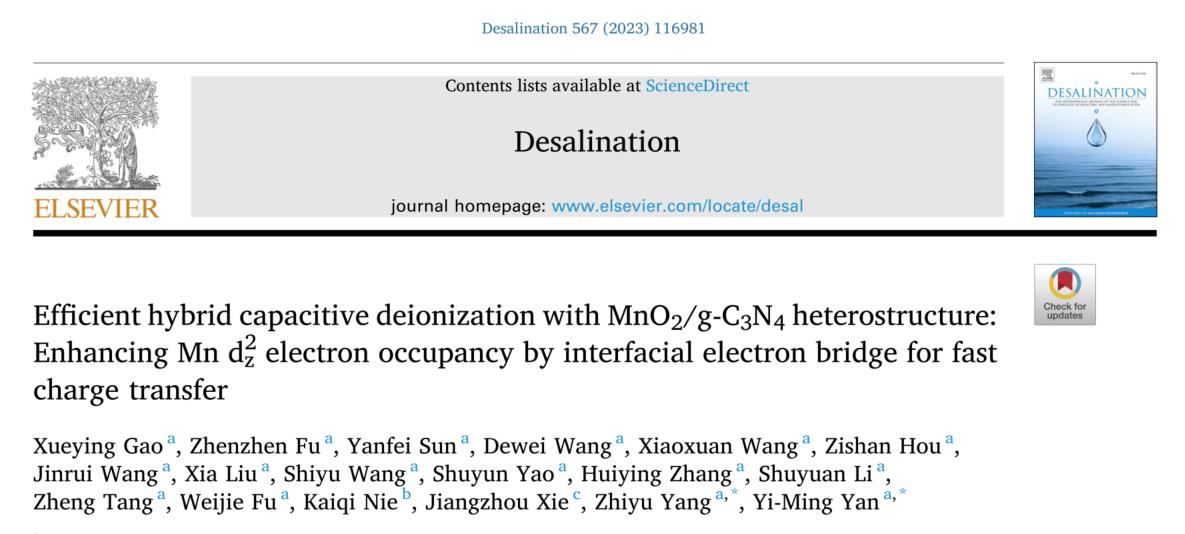 北京化工大學的嚴乙銘教授、楊志宇研究員課題組在Desalination期刊發(fā)表了題為“Efficient hybrid capacitive deionization with MnO2/g-C3N4heterostructure: Enhancing Mn dz2 electron occupancy by interfacial electron bridge for fast charge transfer”的論文。本文通過在MnO2/g-C3N4異質結構中構建界面電子橋,增強的Npz-Mndz2軌道雜化成功提高了其用于HCDI的性能。Npz-Mndz2軌道雜化誘導了從g-C3N4到MnO2的電子遷移,實現(xiàn)了高的Mn dz2電子占據(jù)。在工作電壓為1.2V的條件下,MnO2/g-C3N4表現(xiàn)出68mg g-1的除鹽量,3.6mg g-1 min-1的除鹽率以及0.7224kWh kg-1的能耗。這項創(chuàng)新的工作為激活金屬氧化物電化學活性,從而為加速電荷轉移提供了一個可行的方法。?