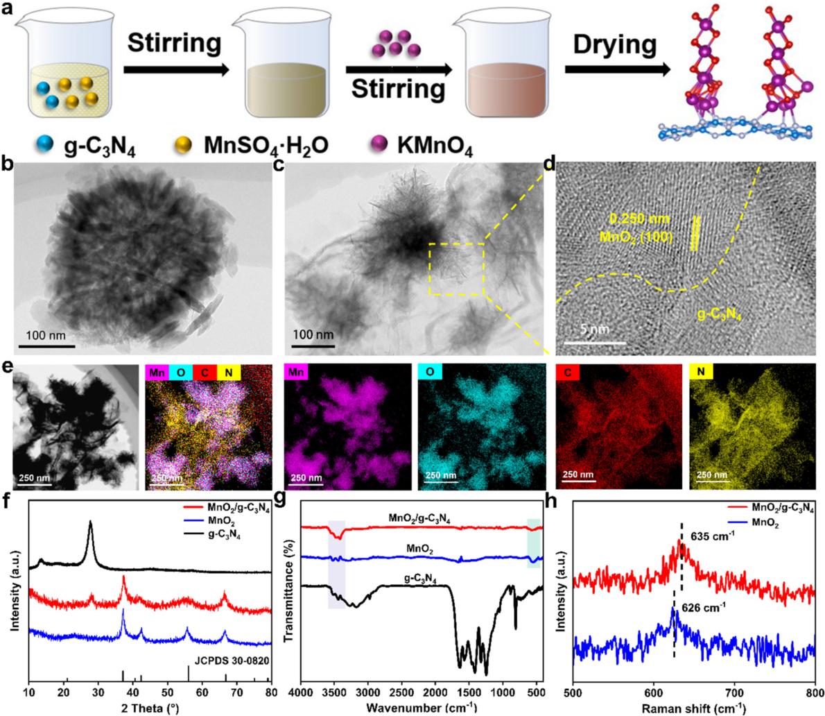用拉曼光譜研究了MnO2與g-C3N4之間的相互作用。圖1h顯示了相比MnO2(626cm-1),MnO2/g-C3N4在635cm-1處的峰明顯右移,表明MnO2/g-C3N4中對稱的Mn-O拉伸振動增強,MnO2與g-C3N4界面相互作用增強。以上表征結果證明成功合成MnO2/g-C3N4異質結構。