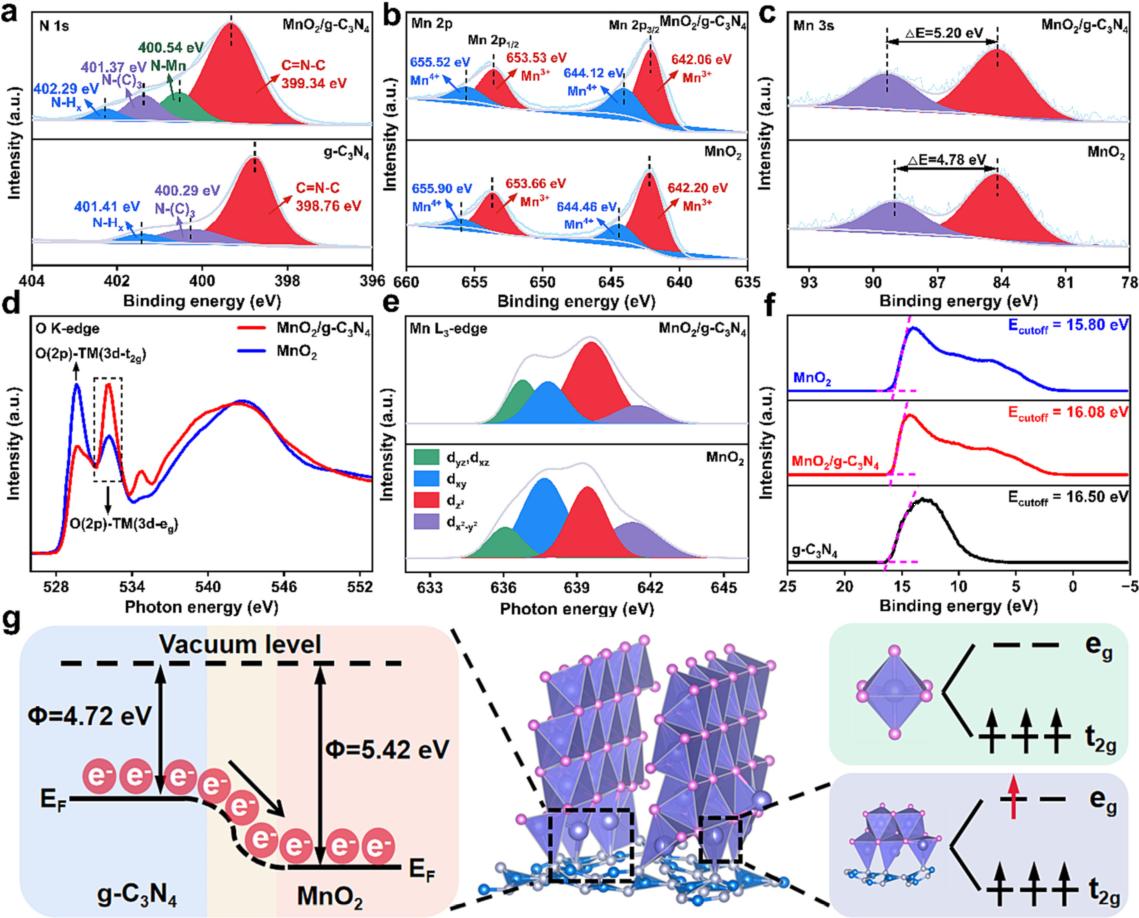 圖2 a-c) XPS圖證明, MnO2/g-C3N4中N 1s結合能的藍移和Mn 2p結合能的紅移證實了電子從g-C3N4向MnO2遷移。;d-e) sXAS圖證明了Mn-N鍵引入后,Mn與O配位的eg軌道發(fā)生了變化,MnO2/g-C3N4的dz2電子占據(jù)(50.06%)高于MnO2(29.14%)。紫外光電子能譜(UPS)結果如圖2f所示,g-C3N4的功函數(shù)低于MnO2的功函數(shù),說明電子從g-C3N4向MnO2遷移。此外,與MnO2相比,MnO2/g-C3N4的功函數(shù)更低,為5.14eV,表明電子轉移特征增強。圖2g提供了MnO2/g-C3N4中電子遷移現(xiàn)象的可視化表示,當g-C3N4引入到MnO2框架中時,由于g-C3N4和MnO2各自的功函數(shù)不同,導致電子從g-C3N4向MnO2遷移。