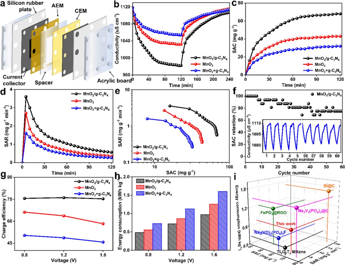 除鹽測試裝置圖如圖4a所示。電導率曲線如圖4b所示,圖4c為SAC隨時間的變化曲線從,圖4d為SAR曲線, Kim-Yoon圖(圖4e)證明MnO2/g-C3N4比MnO2+g-C3N4和MnO2更優(yōu)越的SAC和SAR。如圖4f表示在1.2V下循環(huán)60次后,SAC保持率始終保持在75%。圖4g可知,在不同工作電壓下,MnO2/g-C3N4比MnO2和MnO2+g-C3N4具有更高的電荷效率。此外,可以觀察到三個樣品的能耗隨著工作電壓的增加而逐漸增加(圖4h),MnO2/g-C3N4的SAC、SAR和能耗與先前報道值進行對比分析(圖4i),證明了MnO2/g-C3N4既提高了海水淡化能力,又降低了能耗。