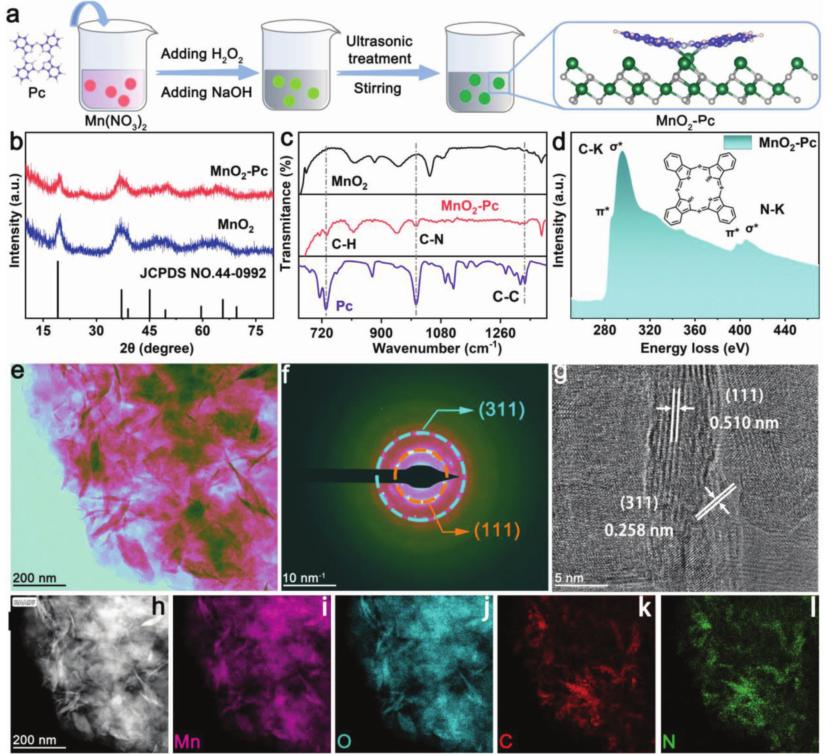 圖1 a)MnO2-Pc合成示意圖;b)XRD譜圖;c)FTIR光譜圖;d)能量損失圖;e) TEM圖像;f)選定區(qū)域電子煙攝圖;g)高分辨率TEM圖像;h-l)元素映射圖