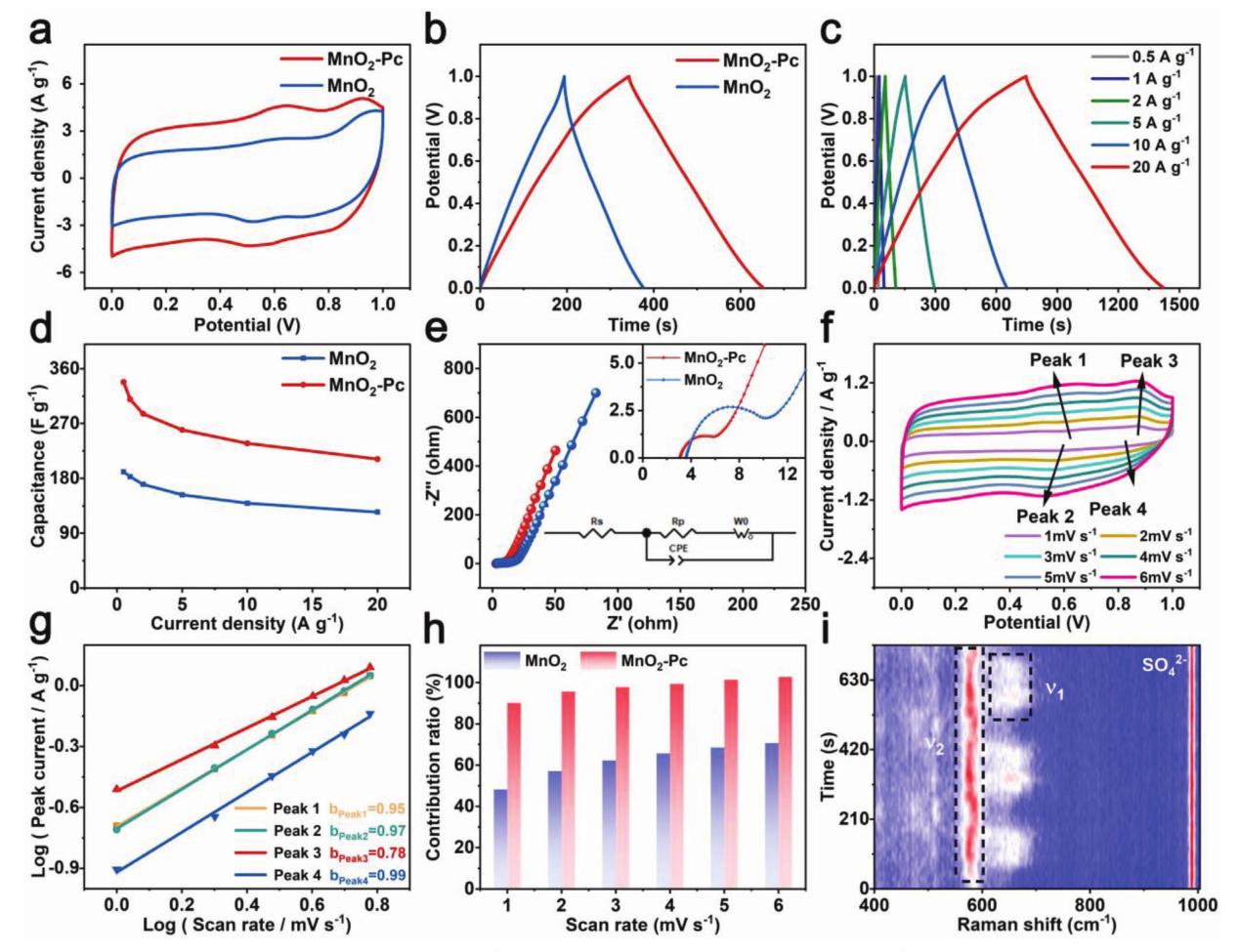 圖2:a)CV曲線,MnO2-Pc 和MnO2 在20 mV s−1;b)GCD曲線,MnO2-Pc 和MnO2 在 1 Ag−1;c)GCD曲線,MnO2-Pc在不同電流密度下;d)比容量 ,MnO2-Pc和MnO2在不同電流密度下;e)Nyquist圖,MnO2-Pc and MnO2;f) CV曲線,MnO2-Pc在不同掃描速率下;g)擬合曲線; h)電流貢獻(xiàn)值; i)三次充放電過程中原位拉曼光譜圖