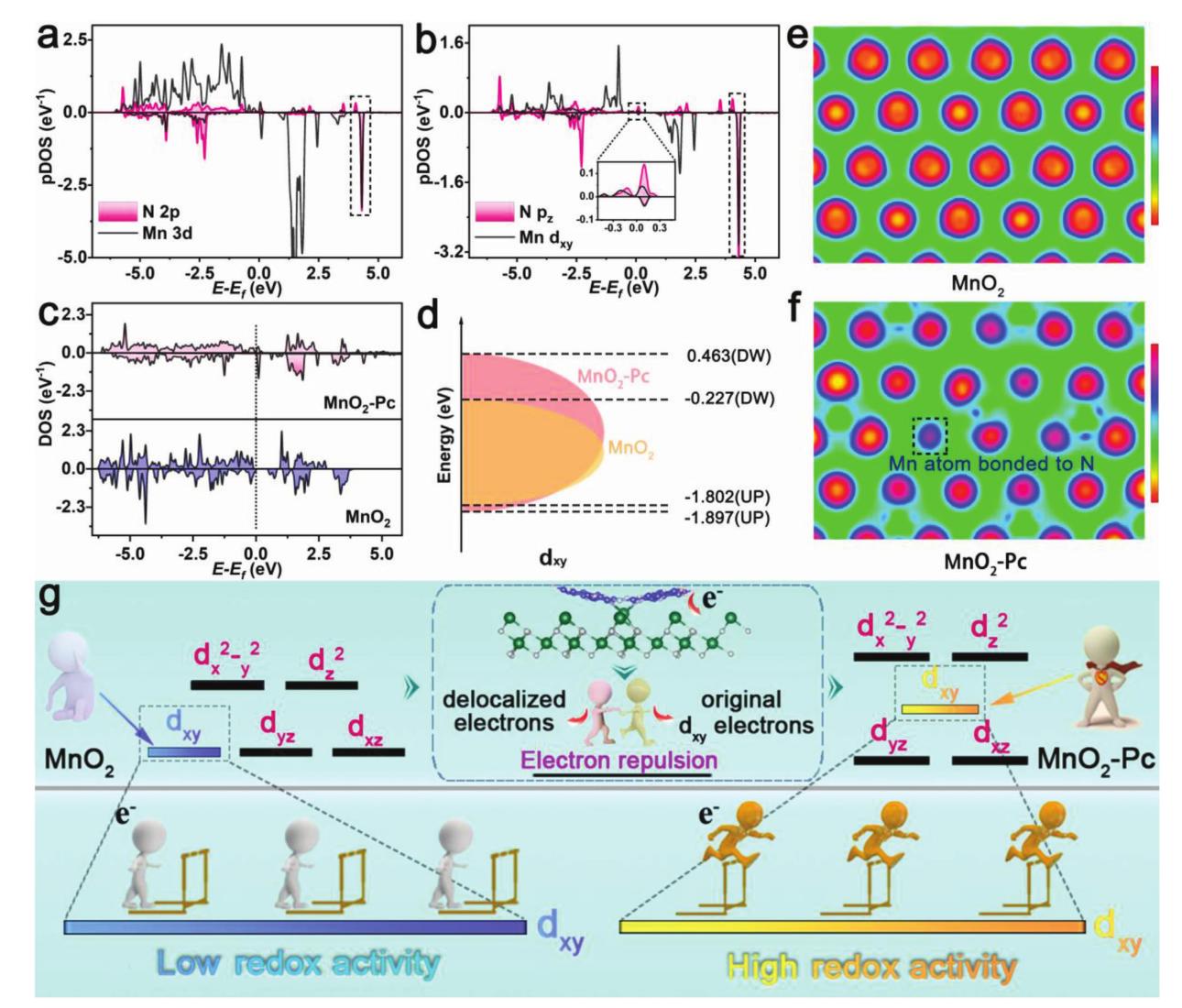 北京化工大學(xué)楊志宇研究員及團(tuán)隊(duì)在知名期刊Advanced Energy Materials上發(fā)表了題為“Elevating the Orbital Energy Level of dxy in MnO6 via d–π Conjugation Enables Exceptional Sodium-Storage Performance”的文章。過渡金屬氧化物 (TMO) 具有固有的低電子電導(dǎo)率,而原子軌道相關(guān)的調(diào)節(jié)對(duì)于促進(jìn)儲(chǔ)能應(yīng)用中的電子轉(zhuǎn)移動(dòng)力學(xué)至關(guān)重要。該研究利用 d-π 共軛策略來提高 TMO 的電子電導(dǎo)率。選擇具有大共軛體系的酞菁 (Pc) 分子來修飾過渡金屬氧化物 (δ-MnO2)。通過密度泛函理論(DFT)模擬,驗(yàn)證MnO2和Pc之間的強(qiáng)d-π共軛可以提高M(jìn)nO6單元中低能軌道(dxy)的軌道能級(jí),進(jìn)而提高dxy的氧化還原活性,從而顯著提高電化學(xué)鈉存儲(chǔ)性能。