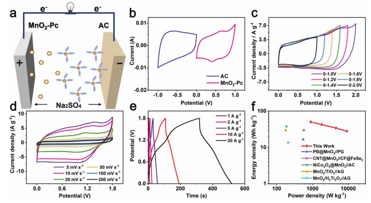 圖4 a) MnO2-Pc(陰極)// AC(陽極)ASC原理圖。b) 1.0 m Na2SO4溶液中MnO2-Pc和AC的CV曲線。c) 100 mV s−1時(shí)不同電位范圍的CV曲線。d)不同掃描速率下CV曲線;e) GCD曲線(不同電流密度)。f)本工作中ASC的Ragone圖與報(bào)道結(jié)果進(jìn)行比較。