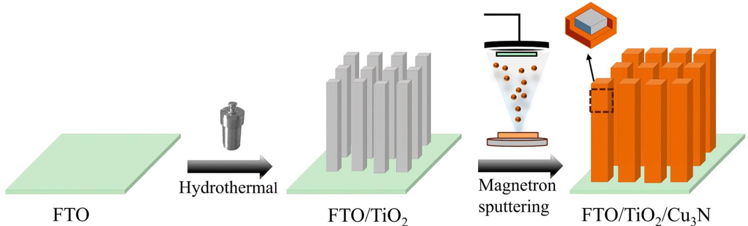 針對(duì)上述科學(xué)問(wèn)題,湖北工業(yè)大學(xué)理學(xué)院(芯片產(chǎn)業(yè)學(xué)院)程正旺等提出了一種基于匹配帶隙和功函數(shù)的p-n異質(zhì)結(jié),不僅促進(jìn)了可見(jiàn)光吸收,還極大地提高了光生載流子的分離與遷移效率,實(shí)現(xiàn)了高效、穩(wěn)定的PEC可見(jiàn)光析氫。該工作以“Construction of nanorod-shaped TiO2/Cu3N p–n heterojunction for efficient visible-light hydrogen evolution”為題發(fā)表在國(guó)際期刊Journal of Materials Chemistry C上。