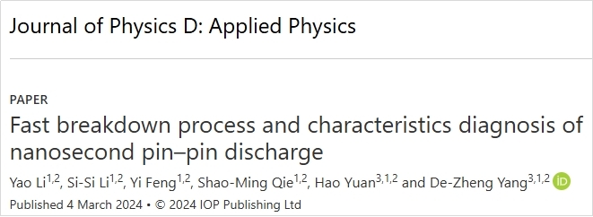近日,大連理工大學物理學院的楊德正教授團隊在納秒火花放電中的超快擊穿過程的研究中取得新進展,研究成果以” Fast breakdown process and characteristics diagnosis of nanosecond pin-pin discharge”為題發(fā)表在國際**期刊“Journal of Physics D: Applied Physics”上。