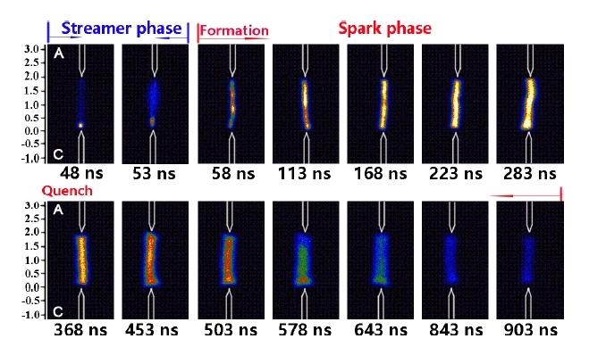 本文系統(tǒng)地研究了大氣壓下單個納秒脈沖內(nèi)的火花放電擊穿現(xiàn)象,通過聯(lián)合使用條紋相機與ICCD相機,捕捉到了單脈沖內(nèi)火花放電通道的擊穿及演化過程。同時,利用時間分辨的光學發(fā)射光譜(OES)技術(shù)對放電過程中產(chǎn)生的各活性物種的產(chǎn)生及其淬滅過程進行了分析,并對納秒脈沖火花放電等離子體的氣體溫度以及電子密度等特性進行了診斷。
