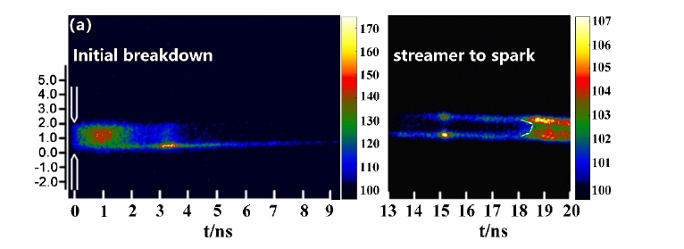 當把條紋相機開到10ns的時間窗口下時(Δ t=100 ps),可更加清晰地觀測到火花放電通道的擊穿和產(chǎn)生的過程(圖4)。圖中可見在陰極亮斑出現(xiàn)之前存在一個均勻放電的階段,這個階段大概持續(xù)了1.8ns,而這個階段在圖2中無法被ICCD相機分辨出來。條紋相機圖像清楚地揭示了火花通道形成的五個過程。(1)初始均勻放電階段;(2)陰極亮斑的出現(xiàn);(3)兩個電極附近陰極絲及陽極絲的出現(xiàn);(4)陰極絲及陽極絲的傳播;(5)陰極絲及陽極絲的匯合以及火花放電通道的形成。