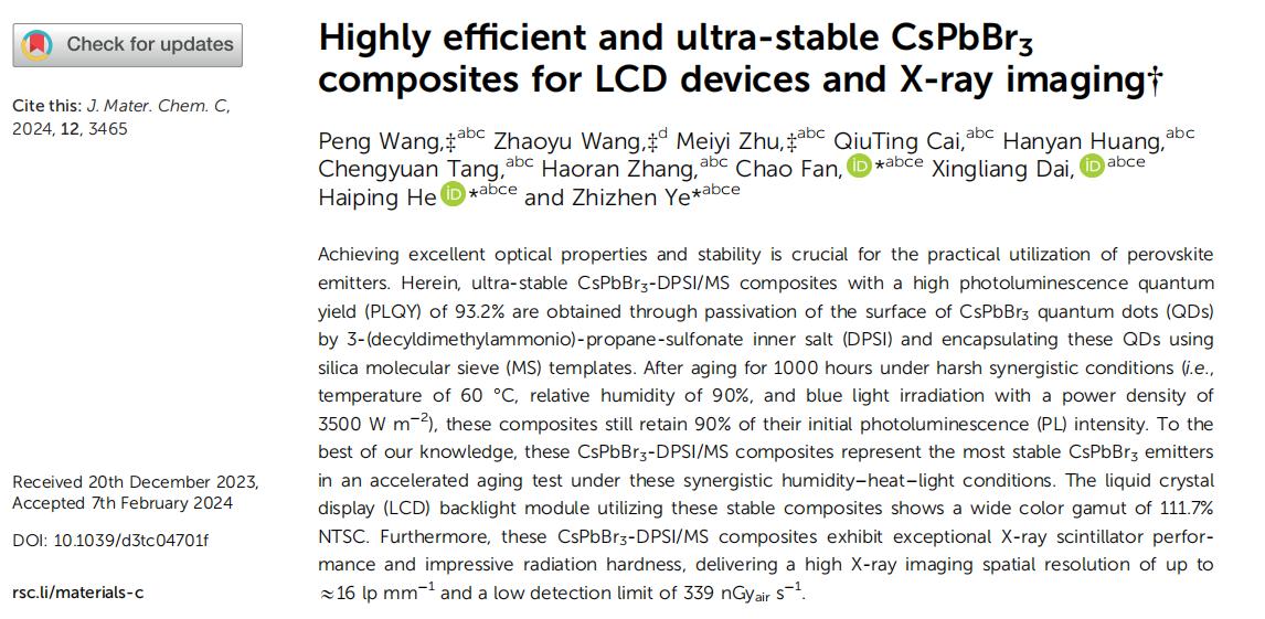 近日,浙江大學(xué)材料學(xué)院葉志鎮(zhèn)院士團隊在高光效、高穩(wěn)定鈣鈦礦復(fù)合結(jié)構(gòu)方面取得重要進展,研究成果以“Highly efficient and ultra-stable CsPbBr3 composites for LCD devices and X-ray imaging”為題發(fā)表在國際知名學(xué)術(shù)期刊Journal of Materials Chemistry C (doi:10.1039/d3tc04701f)上。浙江大學(xué)為該論文第一單位,王朋博士、王昭宇博士、朱美怡博士為共同第一作者,葉志鎮(zhèn)院士、何海平教授、樊超博士為共同通訊作者。