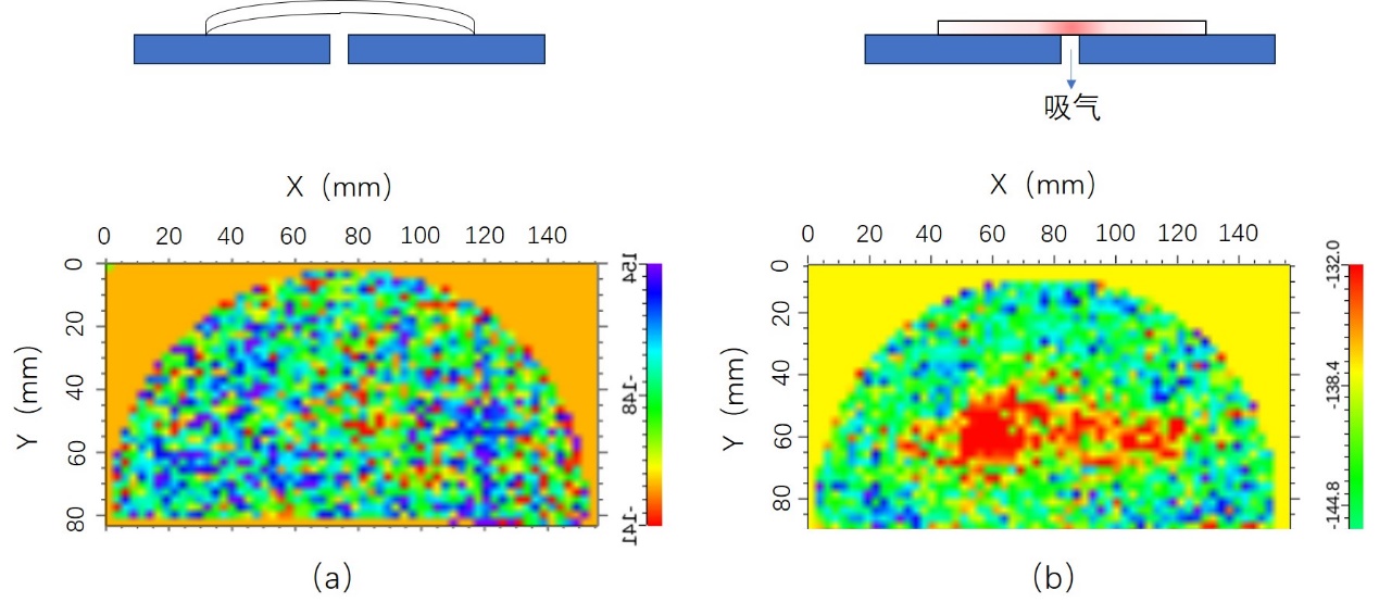 圖 1 用拉曼光譜法測(cè)量半片6吋SiC應(yīng)力分布。(a)未打開(kāi)真空吸氣,樣品自然放置在樣品盤(pán)上,有翹曲但應(yīng)力分布均勻;(b)打開(kāi)真空吸氣將樣品吸牢在樣品盤(pán)上,樣品中間部位明顯出現(xiàn)應(yīng)力集中區(qū)域(偽彩色為紅色的區(qū)域)。