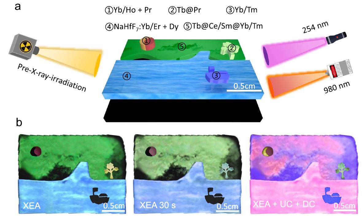 多色發(fā)光材料在多通道生物檢測(cè)、高密度信息存儲(chǔ)、多維度顯示以及多功能光電器件等領(lǐng)域具有重要的科學(xué)與應(yīng)用價(jià)值。中國(guó)計(jì)量大學(xué)光電學(xué)院徐時(shí)清教授/雷磊團(tuán)隊(duì)報(bào)道了兩種通用方法對(duì)時(shí)間維度的多色體系演變進(jìn)行調(diào)控。第一種是核@殼結(jié)構(gòu)的氟化物納米粒子,在受到X射線激發(fā)后,可形成時(shí)間依賴的余輝顏色演變過(guò)程。另一種是核@殼@殼結(jié)構(gòu)的氟化物納米粒子,同時(shí)具備X射線激發(fā)余輝(XEA)、上轉(zhuǎn)換(UC)和下轉(zhuǎn)移(DS)的發(fā)光特點(diǎn),能形成不同波長(zhǎng)激發(fā)條件下的時(shí)間顏色演變。(https://doi.org/10.1038/s41467-022-33489-1)