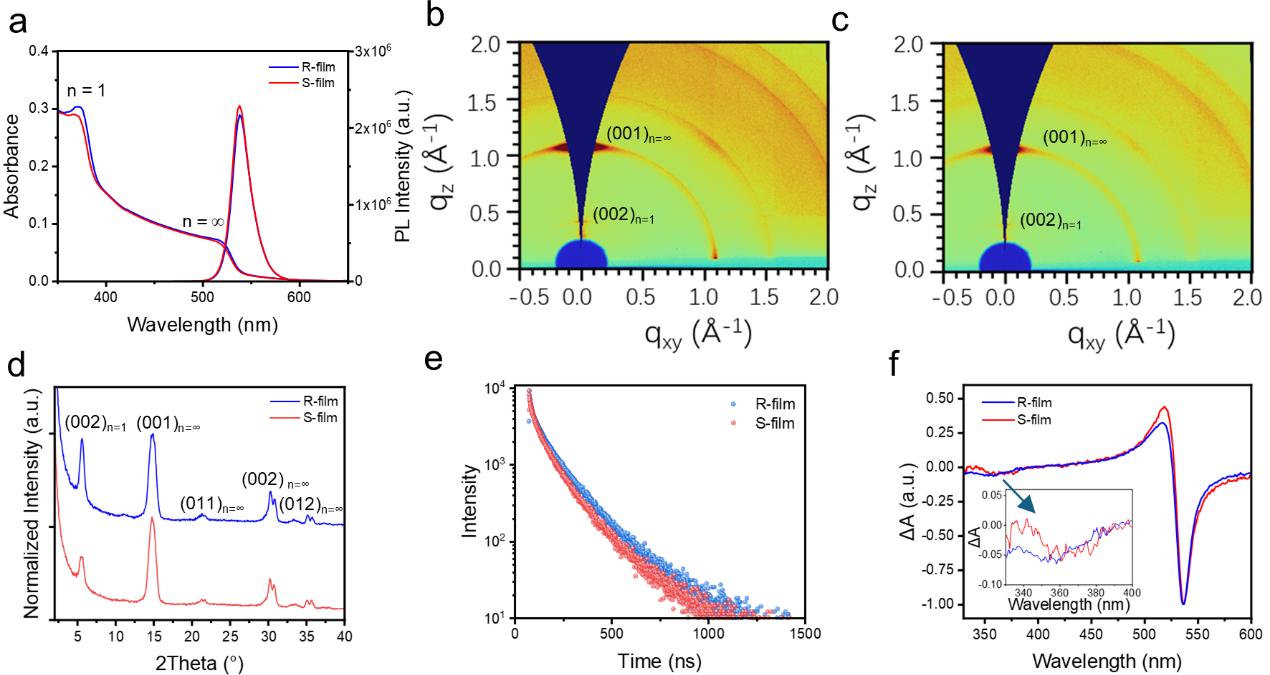 手性鈣鈦礦材料的相結(jié)構(gòu)與手性誘導(dǎo)的自旋軌道耦合(CISOC)效應(yīng)在自旋操控中具有重要作用。研究團(tuán)隊(duì)通過廣角X射線掠入射小角散射(GIWAXS)和X射線衍射(XRD)技術(shù),解析了手性鈣鈦礦薄膜的多相結(jié)構(gòu),發(fā)現(xiàn)n = 1相位于薄膜的底界面,而3D相位則主要作為復(fù)合和發(fā)光中心。這種獨(dú)特的垂直相結(jié)構(gòu)分布有利于材料的自旋選擇性。