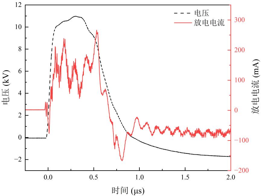 同時(shí),實(shí)驗(yàn)過程中采集了Ar等離子體射流放電電壓電流波形,如圖4所示。其中,放電電流為總電流減去位移電流。從圖中可以發(fā)現(xiàn)Ar等離子體射流在一個(gè)脈沖周期內(nèi)存在兩次放電,分別發(fā)生在上升沿和下降沿,且上升沿的放電持續(xù)時(shí)間較長(zhǎng)。