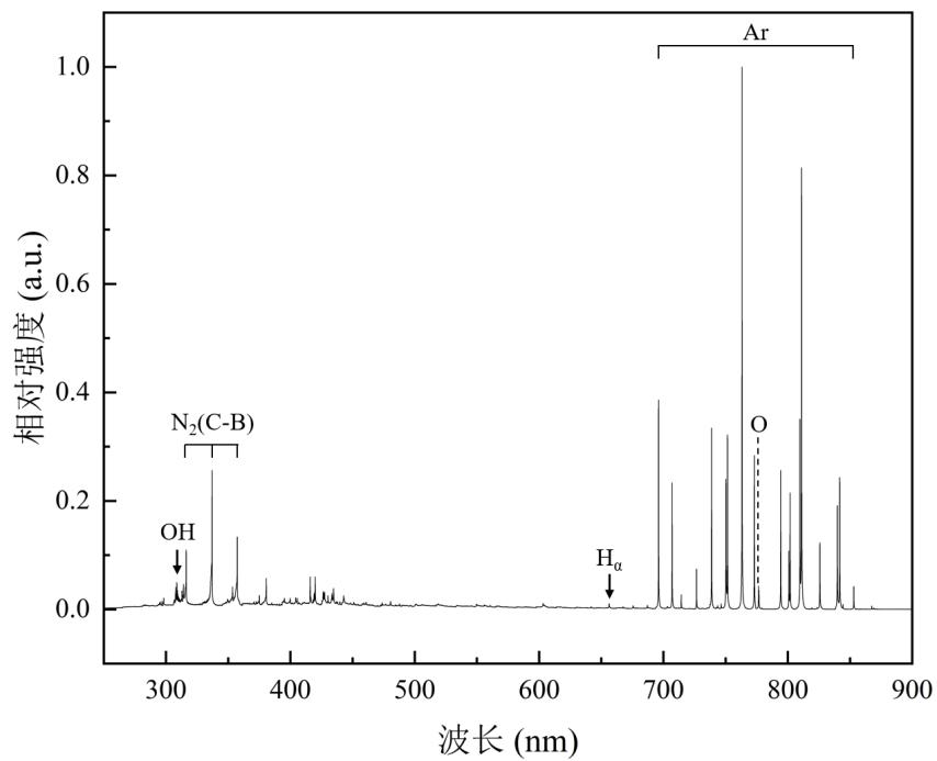 圖5展示了Ar等離子體射流在250nm-900nm范圍內(nèi)的發(fā)射光譜。測(cè)量過程中利用凸透鏡將等離子體的發(fā)射光匯聚進(jìn)入光譜儀入射狹縫,狹縫寬度50μm,光柵刻度1200g/cm。從發(fā)射光譜中可以明顯觀察到N2、OH、O原子、Ar等粒子的發(fā)射譜線。