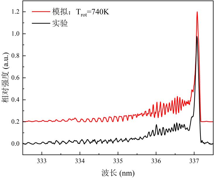 圖7:Ar等離子體射流N2(C3Πμ-B3Πg)(Δν=0)實(shí)驗(yàn)與模擬光譜